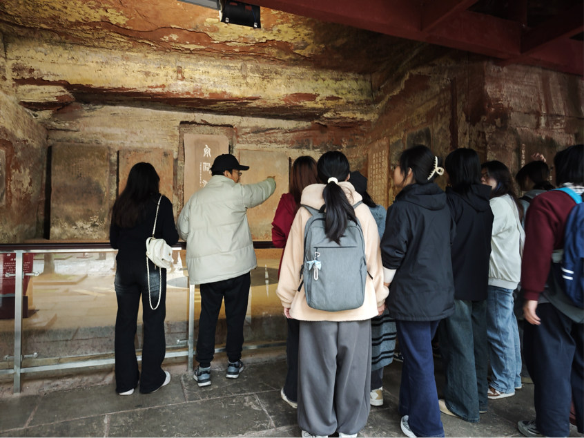 在布满岁月痕迹的洞窟与碑刻前,唐老师以指尖轻抚斑驳石刻,为同学们解析其中蕴含的艺术密码——从书法的结构与气韵,到造像的美学特征与技法表现,教科书中的“传统文化”在此刻具象为可触可感的艺术实体。同学们专注聆听,神情肃穆,展现出对千年文化智慧的由衷敬意。